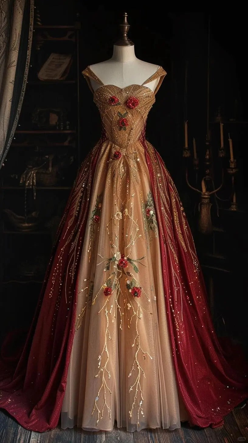 Floral Burgundy Gold Beading Shiny Elegant Long Tulle Ball Gown Evening Dress nv4917