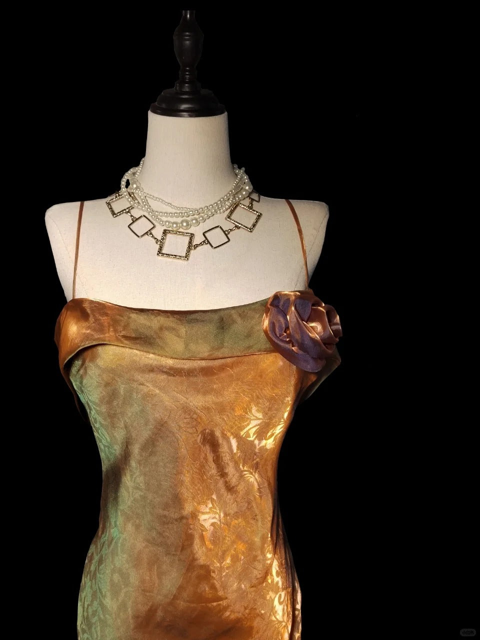 Golden green gorgeous fashionable elegant dark pattern long spaghetti straps satin mermaid tail prom dress evening dress birthday party dress prom dress nv3968