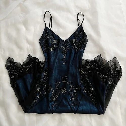 NiceVestidos--Navy Blue Vintage Elegant Exquisite Handmade Beaded Spaghetti Strap Beaded Chiffon Long Ball Gown prom dress Nv5606