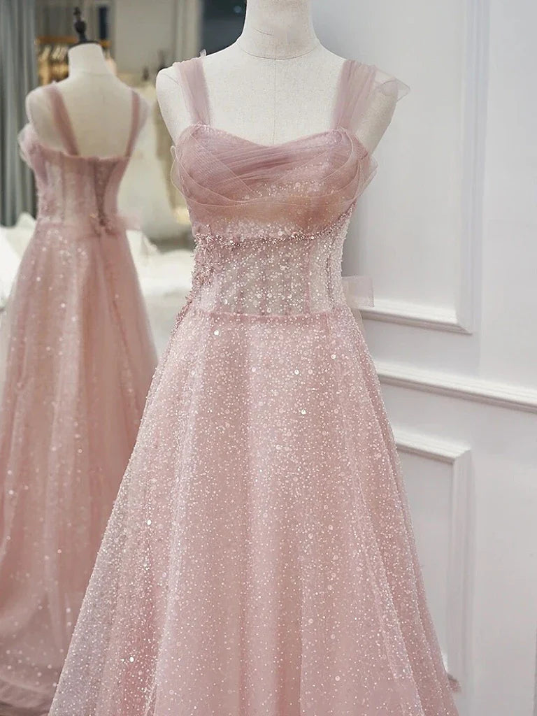 Pink Elegant Spaghetti Strap A-Line Sparkling Beaded Sleeveless Formal Wedding Party Prom Evening Gown Bridesmaid Dresses banquet outfit nv2994