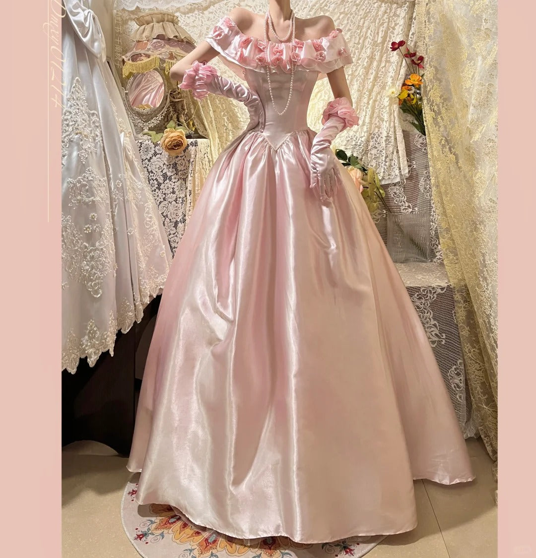 Pink Elegant Sweet Exquisite Vintage Floral Long Satin Ball Gown Evening Gown Party Dress Wedding Dress nv4144