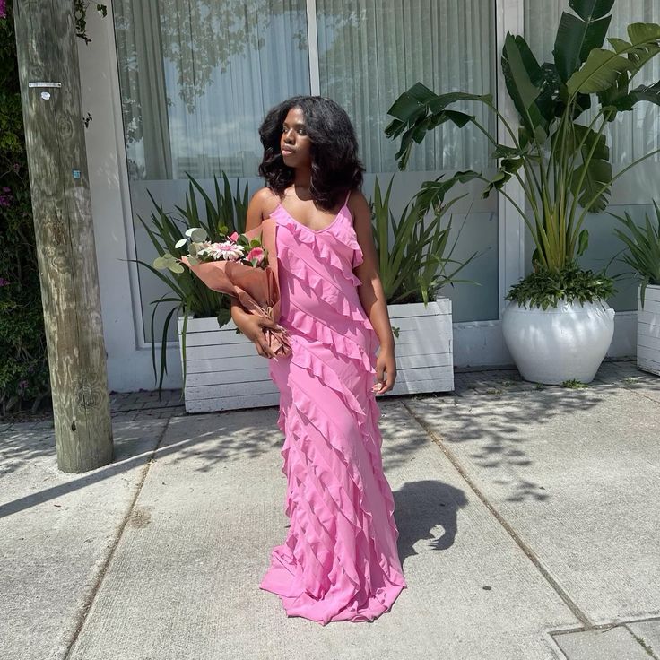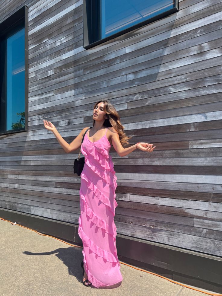 Pink Fashion Unique Spaghetti Strap Long Chiffon Ruffle Floor Length Ball Gown Evening Dress nv3334