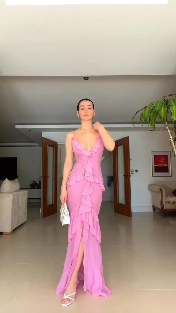 Pink Spaghetti Strap Ruffle Maxi Dress Long Party Dress Evening Dress nv2695