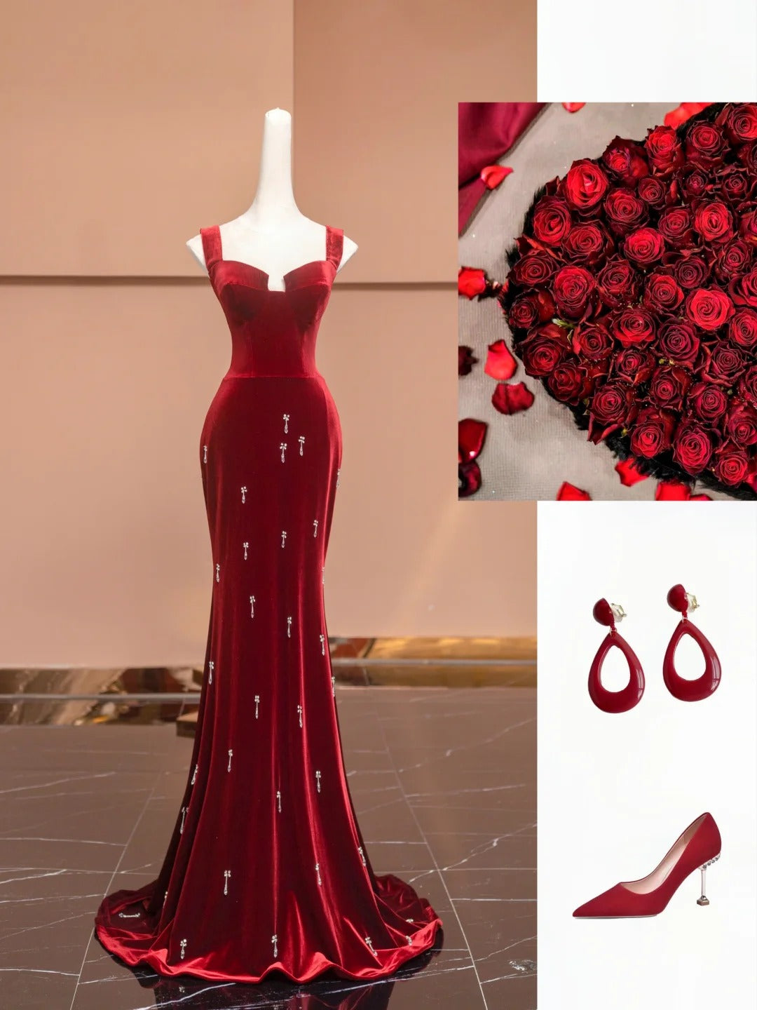Red Exquisite Beaded Long Velvet Mermaid Slim Prom Dress Evening Dress Party Dress nv4730