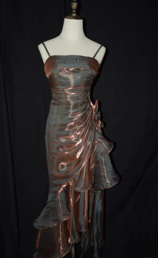 Green retro fashion spaghetti straps long irregular ruffle elegant satin ball gown, evening dress, party dress nv1626