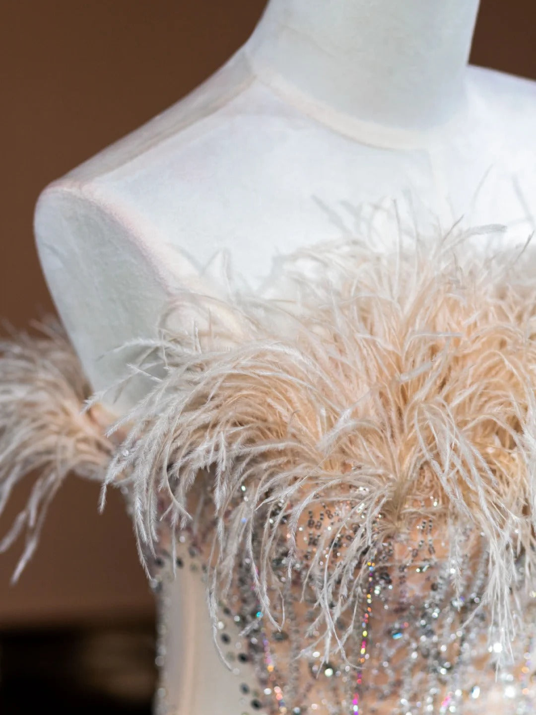 Sweet champagne feather dress beading elegant fashion long tulle Prom Dress evening dress party dress nv4749