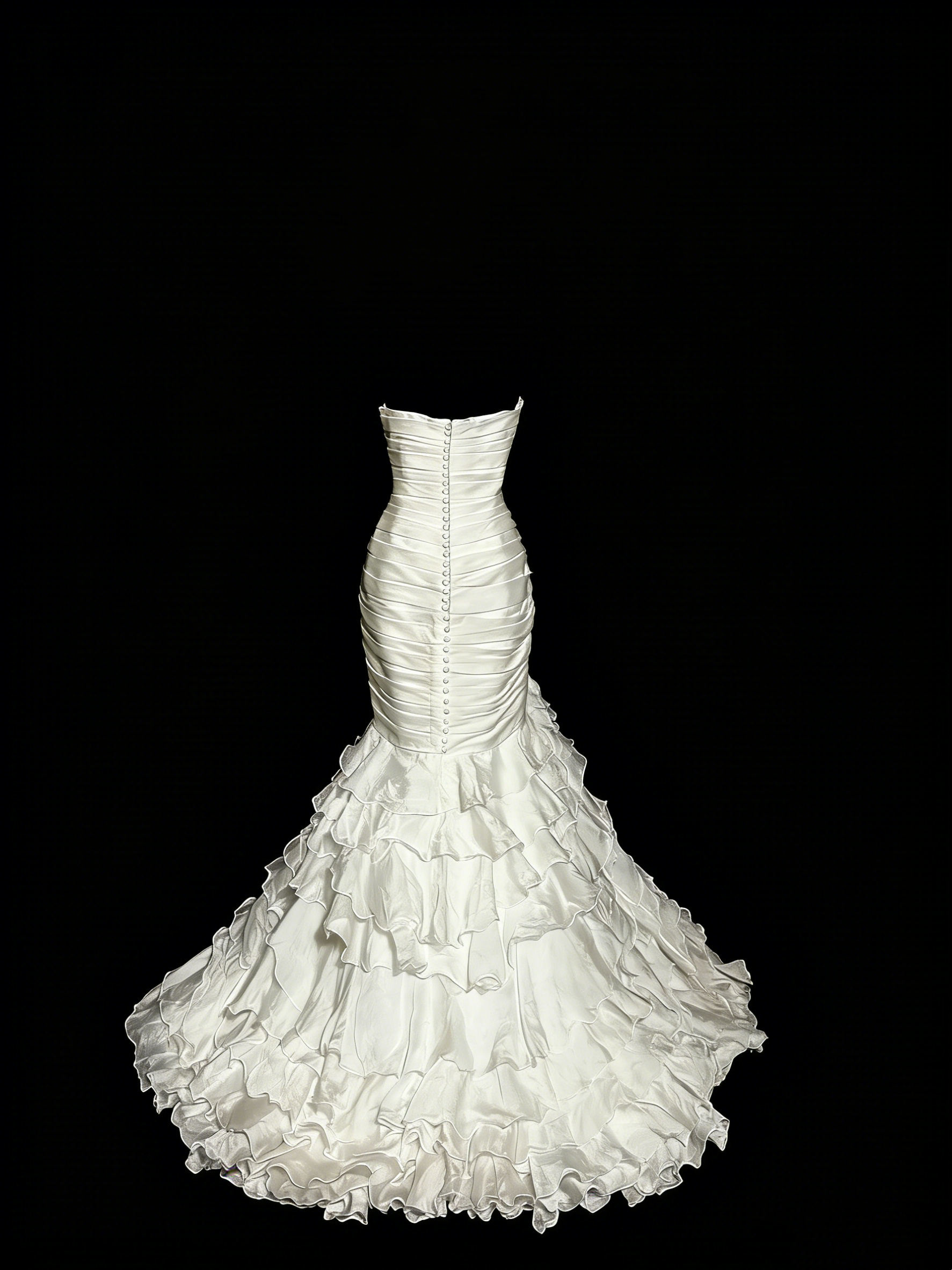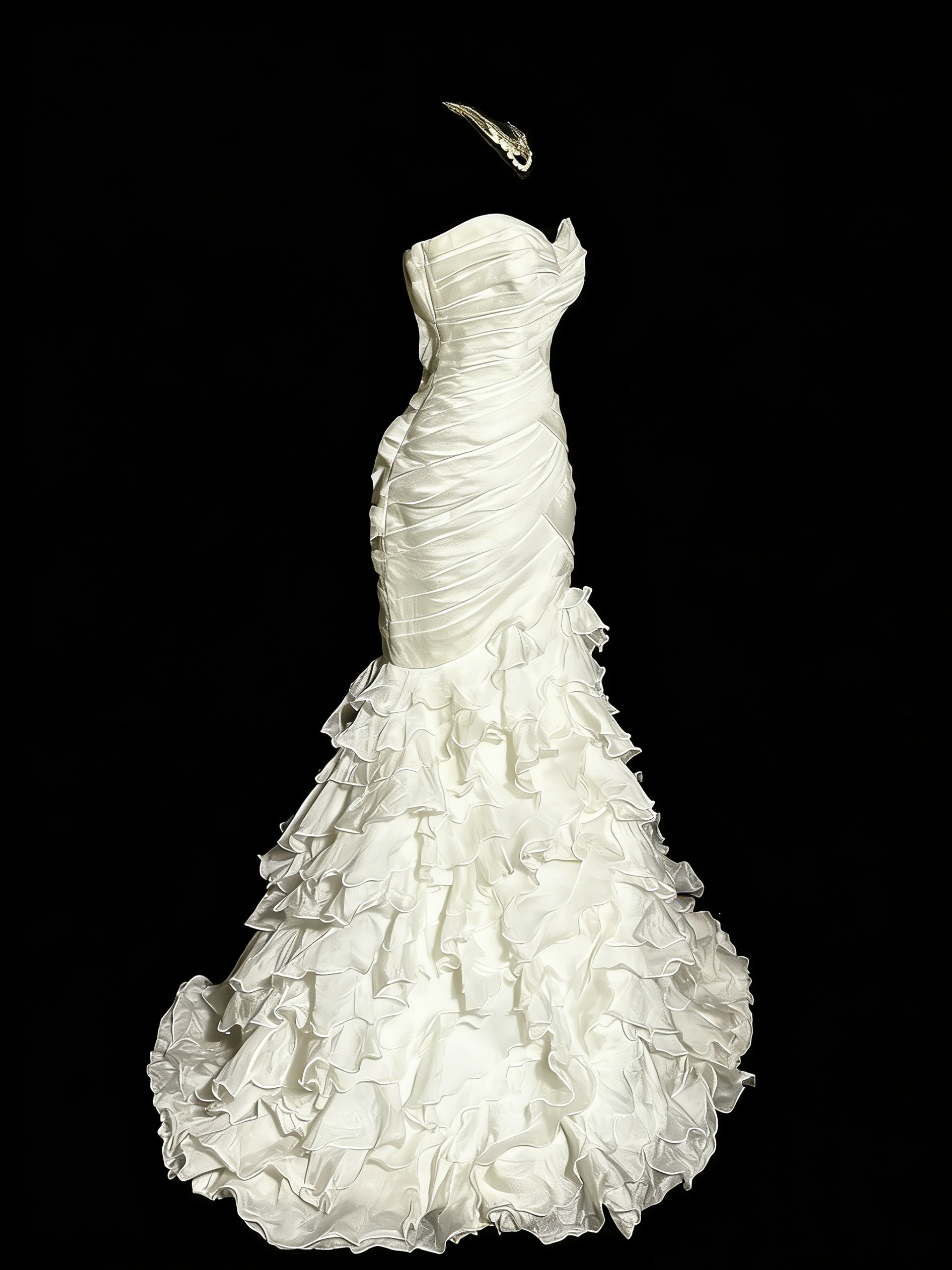 White Strapless Mermaid Gown: Ruched Waist, Ruffled Layers, Court Wedding Style NV6398