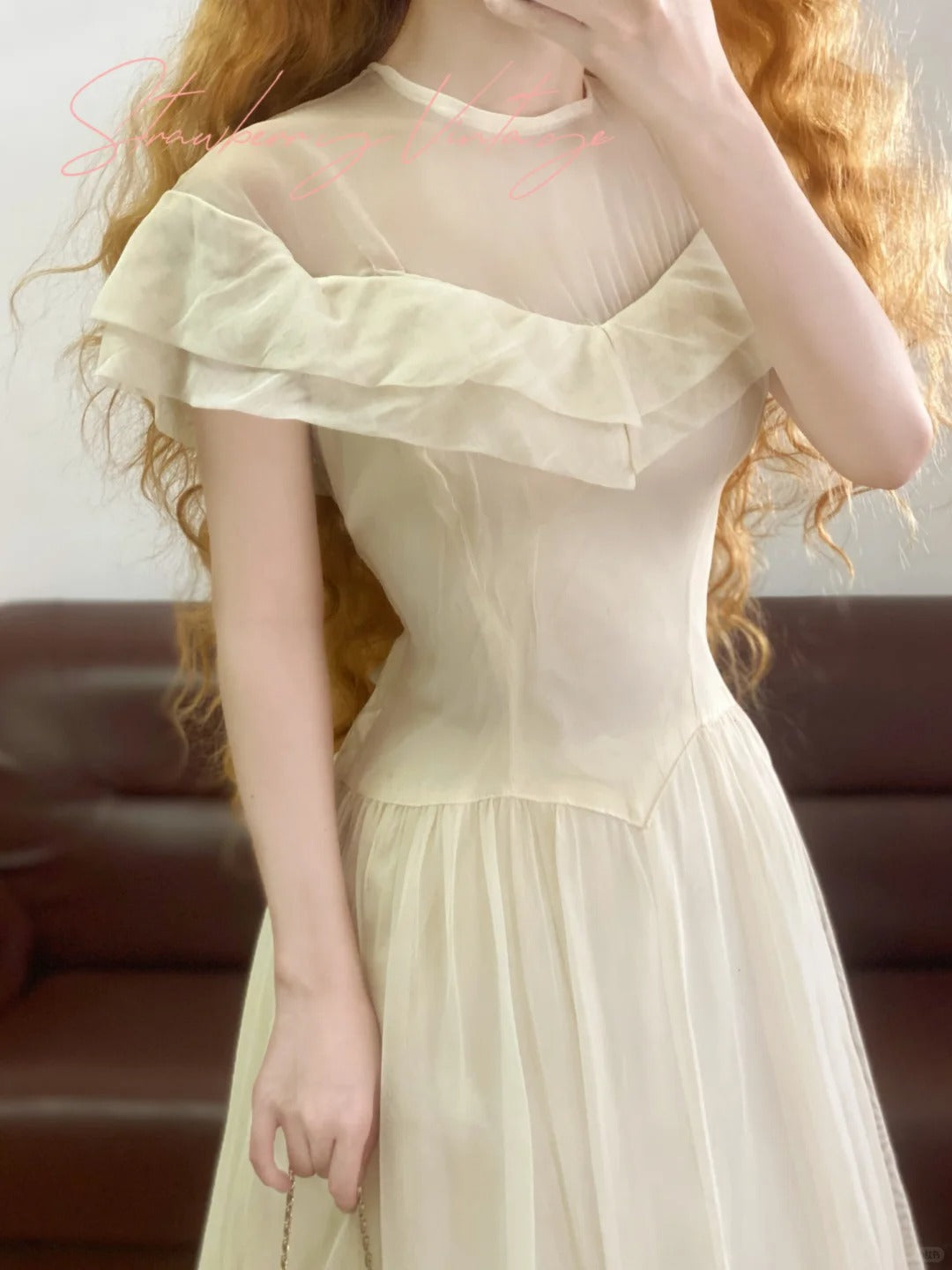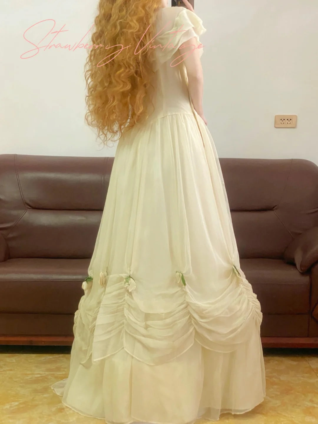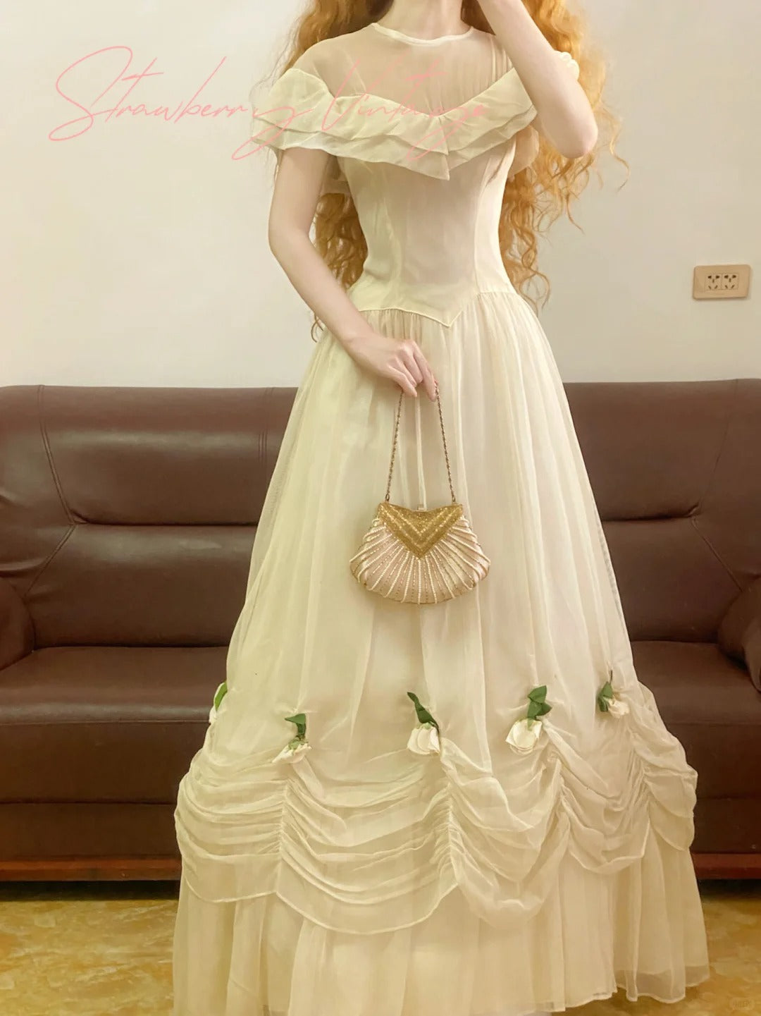 White Vintage Elegant Floral Long Tulle Garden Party Dress nv5015