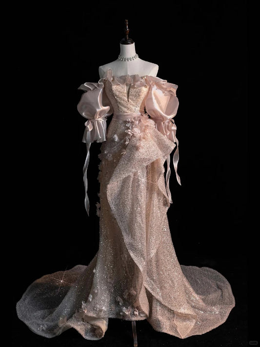 Pink Luxurious Shiny Gorgeous Delicate Floral Appliqué Beads Elegant Stunning Long Tulle Floor Length Train Ball Gown Evening Gown Party Gown nv4117