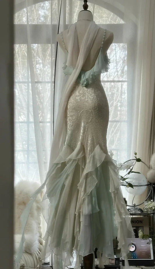 Mint Green Romantic Vintage Mermaid Beaded Long Chiffon Ball Gown Evening Dress Wedding Guest Party Dress Ruffle Fairytale Party Dress nv4109