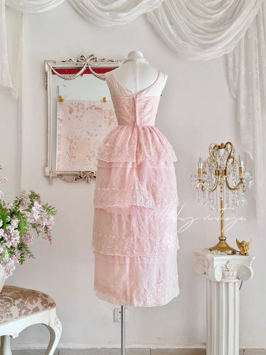 Pink retro cute fashion elegant embroidered flower bud dress long waist tulle velvet bow embellishment cake skirt ball dress evening dress prom dress nv4087
