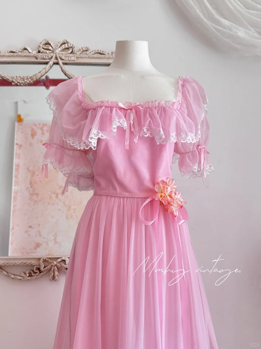 Pink Retro Sweet Cute Fashion Exquisite Lace Bow Puff Sleeve Ruffle Princess Dress Long Tulle Chiffon Ball Dress Evening Dress Birthday Adult Ceremony Party Dress nv4090