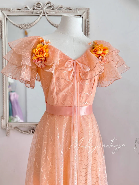 Orange vintage fashion elegant floral ruffled water ripple embroidered long organza floor length ball gown evening gown prom dress nv4086