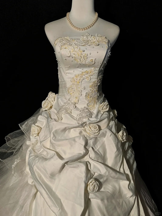 Ivory White Gorgeous 3D Rose Applique Long chiffon Satin Floor Length Ball Gown Evening Gown Wedding Dress nv4036