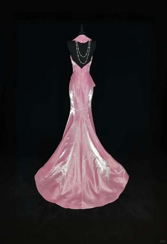 Pink Elegant Fashion Exquisite Beading Long Satin Mermaid Slim Floor Length Train Ball Gown Evening Dress Prom Dress nv3870