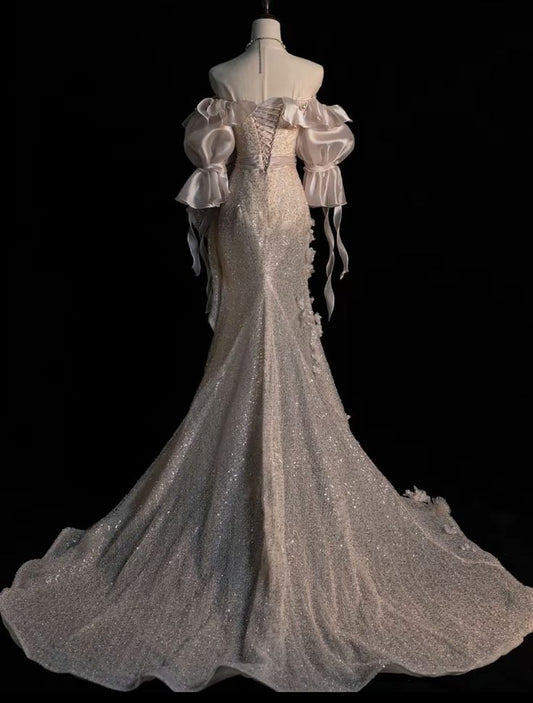 Silver Vintage Elegant Fashion Exquisite Beading Long Fishtail Slim Mermaid Long Satin Ball Gown Evening Dress Prom Dress nv3763