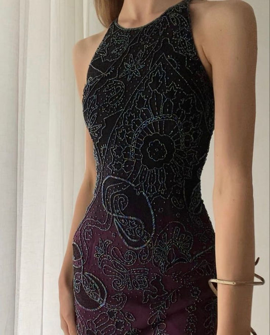 Purple Gorgeous Shiny Exquisite Beaded Spaghetti Straps Long Elegant Sexy Back Slit Satin Ball Gown Evening Dress nv3271