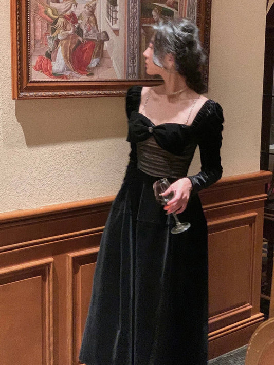 Black fashion elegant velvet dress women vintage long sleeve evening party dress midi dress autumn winter dress prom dress statues dress to impress nv2571