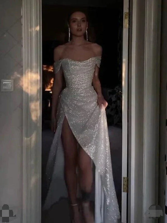 Silver Shiny Elegant Sequin Off-the-shoulder Side Slit Long Gown Prom Dress Evening Gown Party Dress nv2505