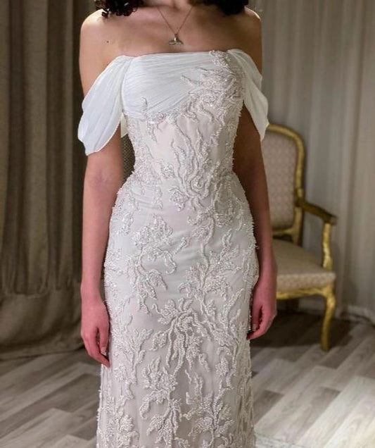 Gorgeous White Off Shoulder Beaded Applique Long Ball Gown Wedding Dress nv1811