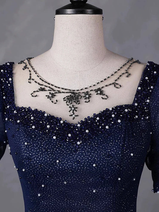 Navy Blue Tulle Beading Long Party Dress, Blue Scoop NecklineShort Sleeve Evening Dress nv1652