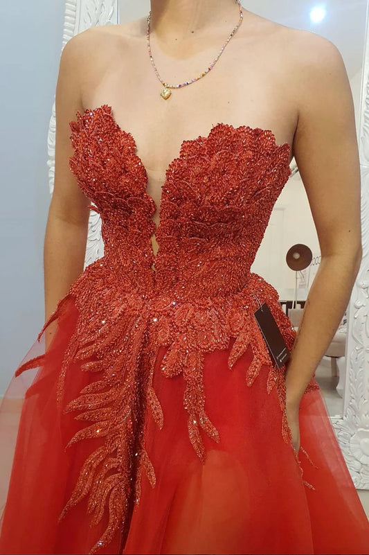 Red Strapless Lace Beading Long Prom Dresses, Red Evening Dresses nv1459