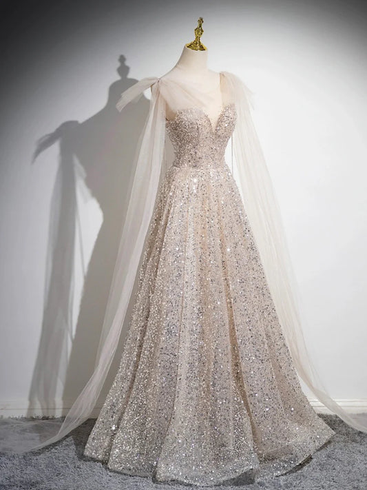 Champagne Tulle Sequins Long Prom Dress, Sparkling A-Line Evening Party Dress nv1415