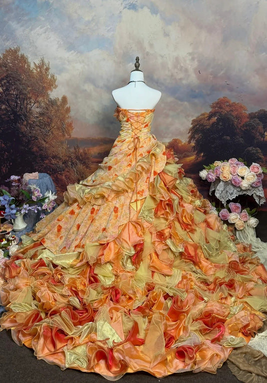 Yellow orange bright and lively candy color vintage beaded long tulle ball gown nv5145