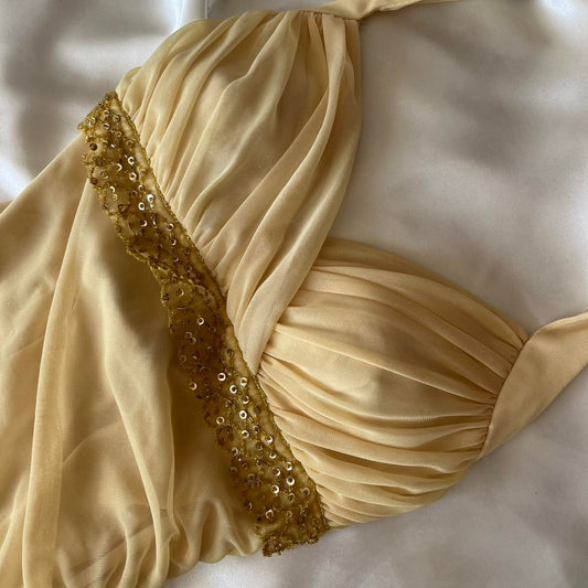 ✨Butter yellow fashion suspenders unique sparkling glitter sweetheart backless neckline beaded tassel long chiffon prom dress nv5378