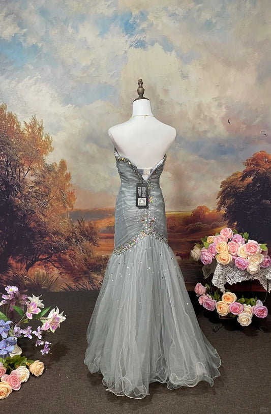 Silver Grey Vintage Elegant Exquisite Gem Beaded Long Tulle Ball Gown Evening Dress Prom Dress nv4079