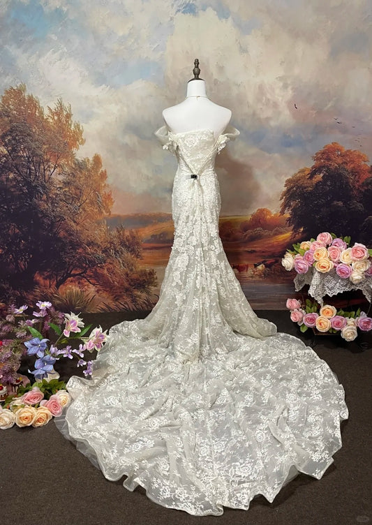 Ivory White Gorgeous Vintage Fashion Elegant Floral Exquisite Beading Long Lace Tulle Floor Length Mermaid Train Slim Ball Gown Evening Gown Wedding Dress nv4065