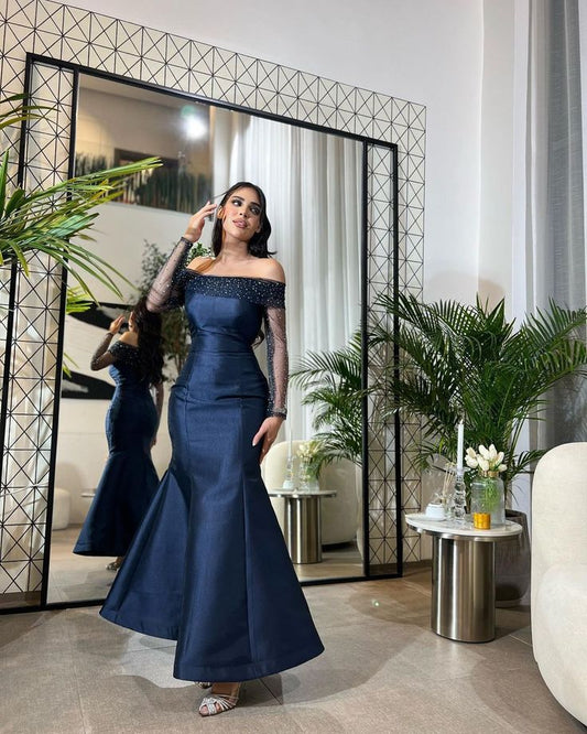 Dark blue gorgeous beaded shiny elegant satin sexy floor-length mermaid slit long prom dress evening dress nv5126