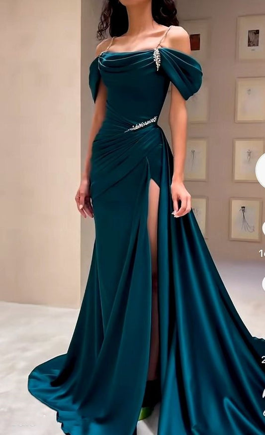 Dark Green Gorgeous Fashion Sexy Spaghetti Straps Ruffled Long Satin Floor Length Train Formal Mermaid Ball Gown Evening Dress Party Dress nv3657