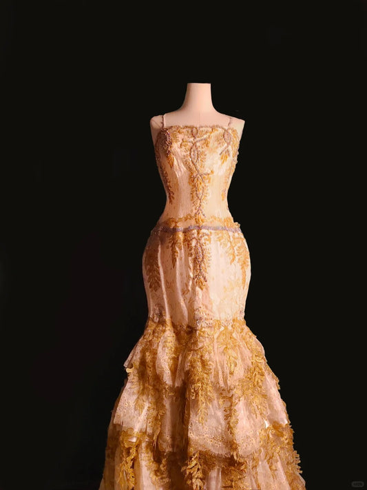 Golden Gorgeous Exquisite Lace Spaghetti Straps Long Tulle Floor Length Train Ball Dress Evening Dress Prom Dress nv3901