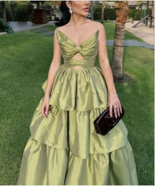Green Elegant Cute A-line Off-shoulder Multi-layered Backless Evening Dress Ball Gown Party Dress nv2378