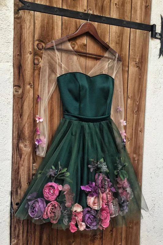 green long sleeves lace short fanshion dress,applique sheer-straps sweetheart satin flower homecoming dress nv537