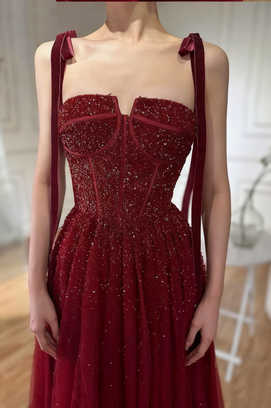 NiceVestidos--Burgundy exquisite beaded spaghetti strap long chiffon fairy dress ball gown evening dress NV5725