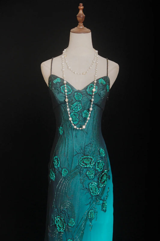 NiceVestidos--Vintage Beaded Glamorous Flowy Teal Gradient Elegant Artistic Floral Beaded Prom Dress NV5790