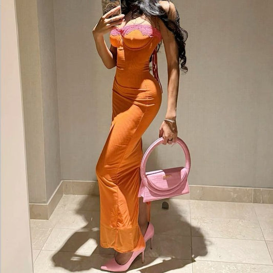 Orange Fashion Spaghetti Strap Lace Long Prom Dress Evening Gown Party Dress nv2847