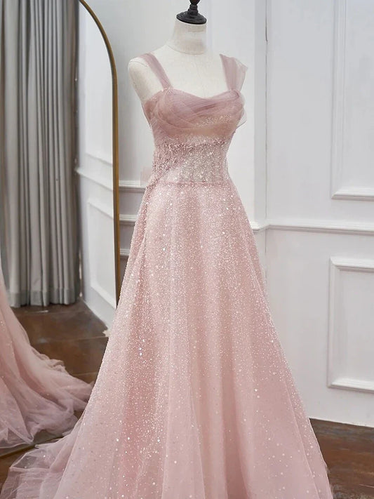 Pink Elegant Spaghetti Strap A-Line Sparkling Beaded Sleeveless Formal Wedding Party Prom Evening Gown Bridesmaid Dresses banquet outfit nv2994
