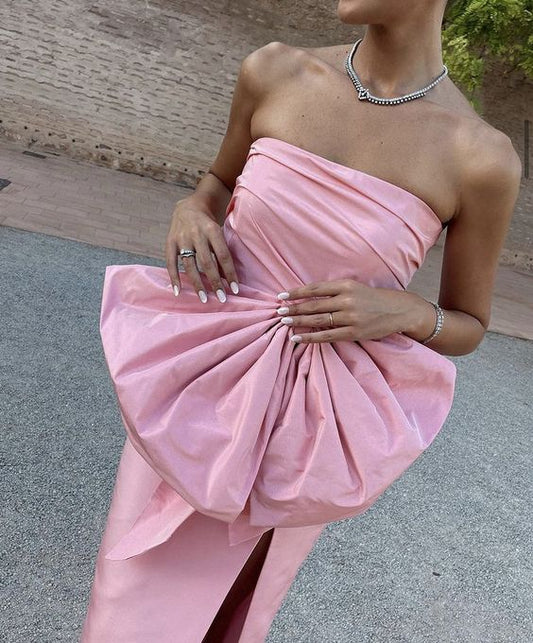 Pink Elegant Simple Unique Bow Satin Maxi Dress Long Slit Ball Gown Evening Dress nv2735