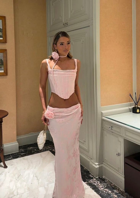 Pink Fashion Elegant Three-Dimensional Rose Flower Two-Piece Suit Long Evening Dress Party Dress nv2843