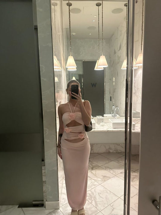 Pink Fashion Unique Floral Strap Long Satin Ball Gown Evening Dress Party Dress nv3447
