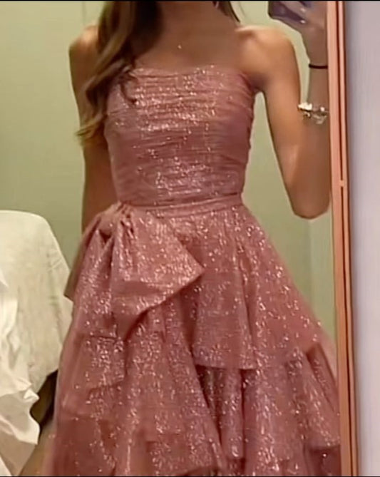 Pink Sweet Square Neck Bowknot Long Layered Ruffle Evening Party Dress Homecoming Dress nv2705