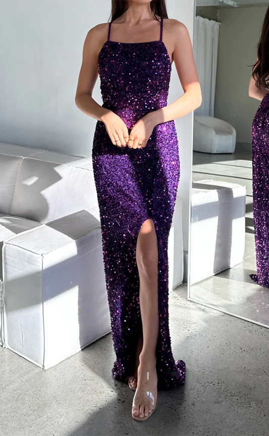 Purple Sequin Bodycon Sexy Square Spaghetti Straps Side Slits Long Party Dress Prom Gown Evening Gown nv2433