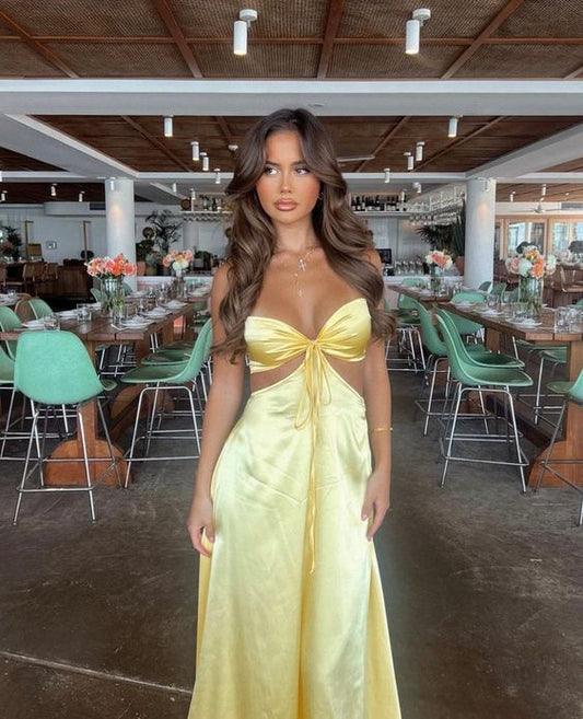 Yellow Elegant Exquisite Beaded Hollow Strap Long Satin Ball Gown Evening Gown Party Dress nv3442