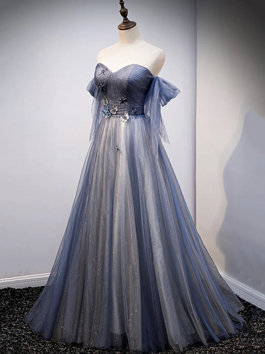 Blue Sweetheart Elegant A-line Off-shoulder Sleeveless Ruffled Tiered Long Formal Prom Dress Evening Dress Party Dress Graduation Dress nv2490