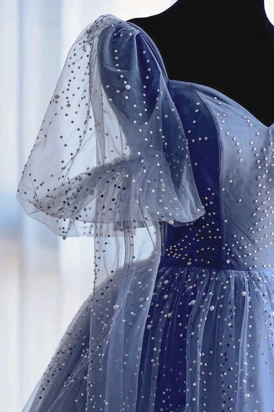 Blue Tulle Beaded Floor Length Prom Dress, A-Line Short Sleeve Evening Party Dress nv1416
