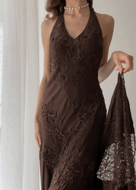 Brown Vintage Elegant Vintage Fashion Romantic Exquisite Beaded Floral Long Floor Length Satin Ball Gown Evening Gown Prom Gown nv4077