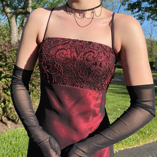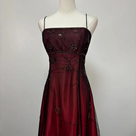 Burgundy Retro Fashion Exquisite Beaded Spaghetti Straps Long Elegant Tulle Ball Gown Evening Dress Party Dress Prom Dress nv3755